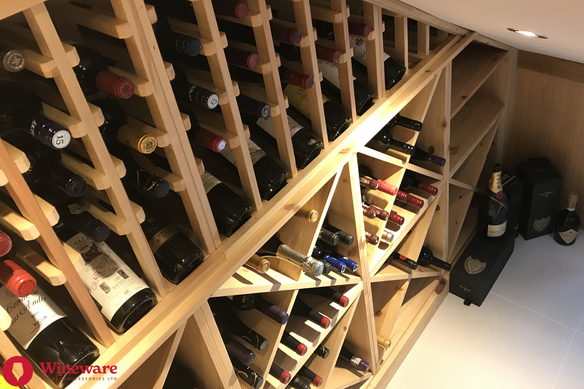 - Wine Rack Design: Cellar cubes, individual bottle storage, individual display bottle storage, worktops and plinths (Solid Pine - Light Oak Stain)