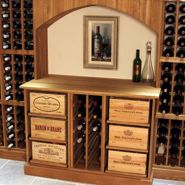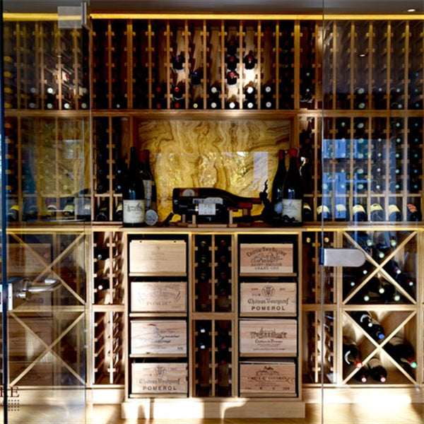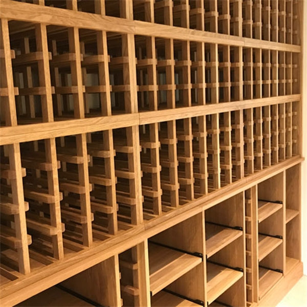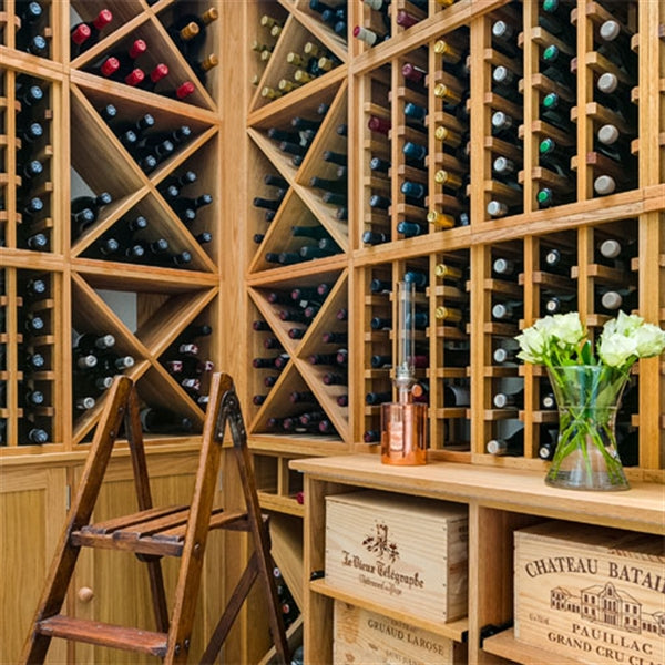 Large private residential wine room in London, using oak racking, cubes, case racks and more