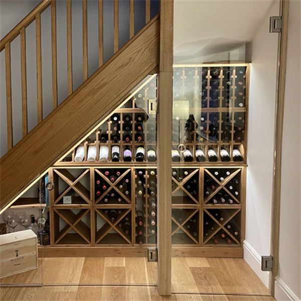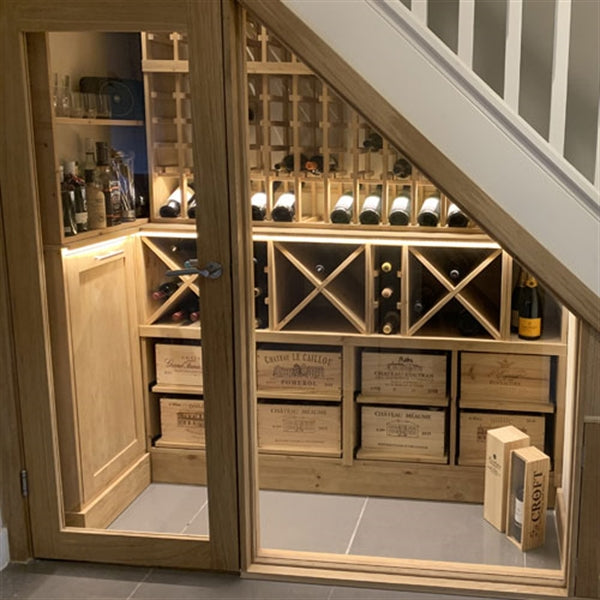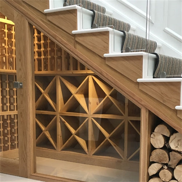 Beautifully displayed bespoke under-stairs wine room in Durham using solid pine