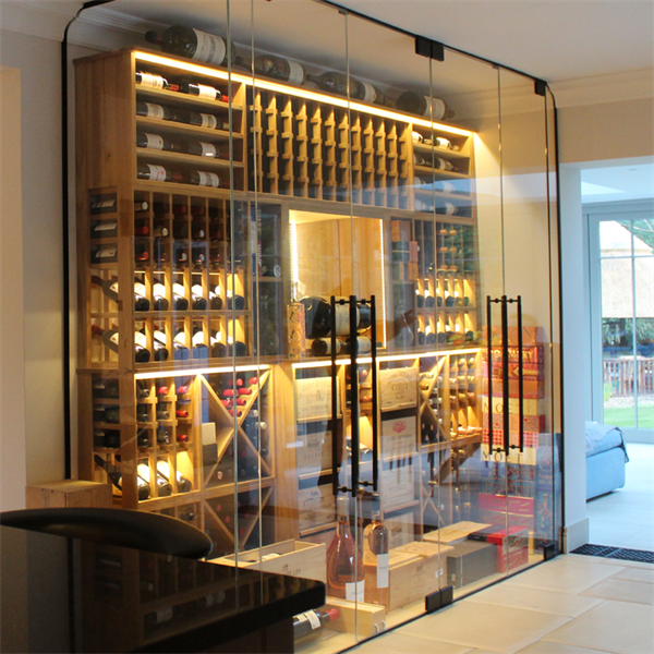 Glass enclosed luxurious oak wine wall in a residential property, Sunningdale, Berkshire