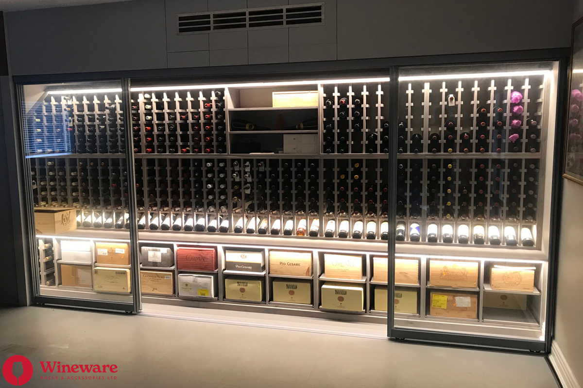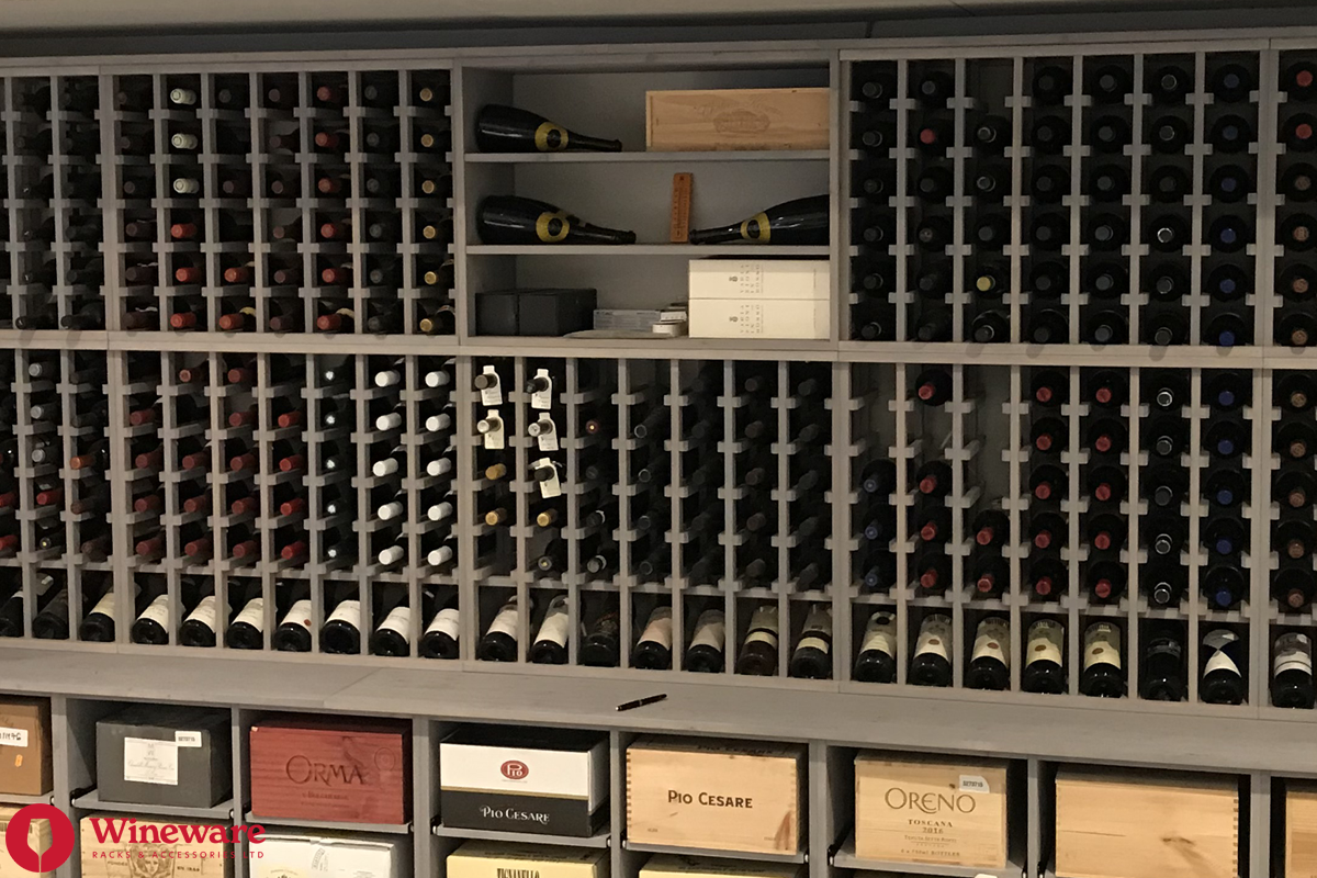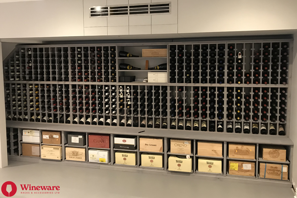 - Wine Rack Design: Individual bottle storage, individual display bottle storage, open display bottle shelving, case racks, worktops, plinths and LED lighting (Solid Pine - Grey Stain)