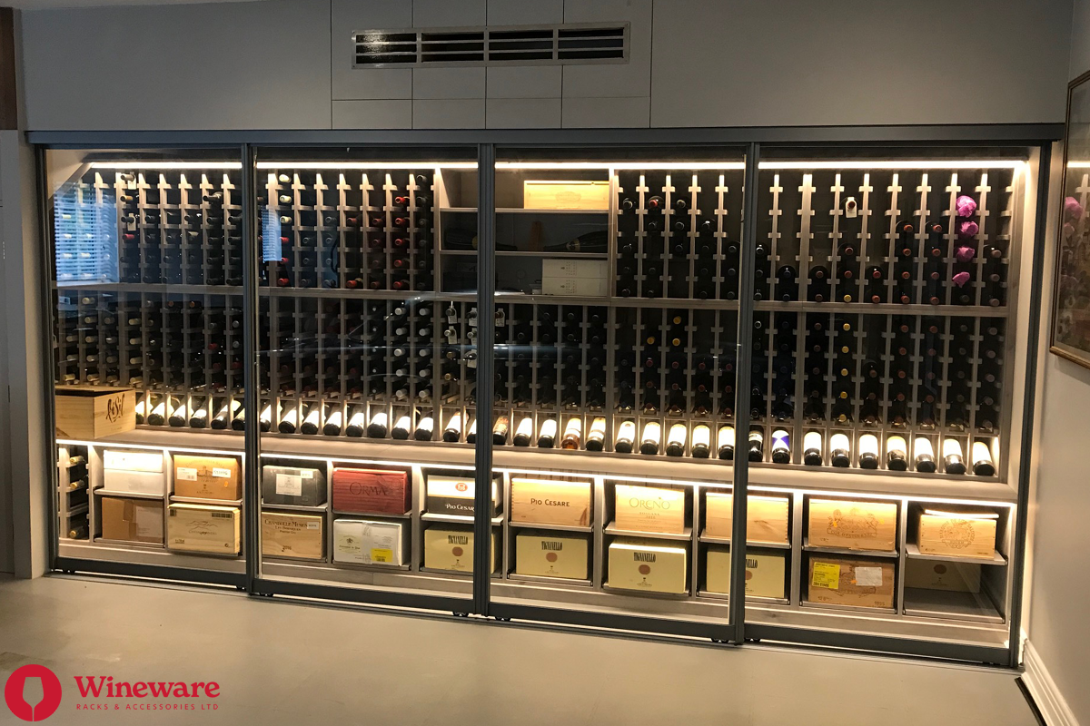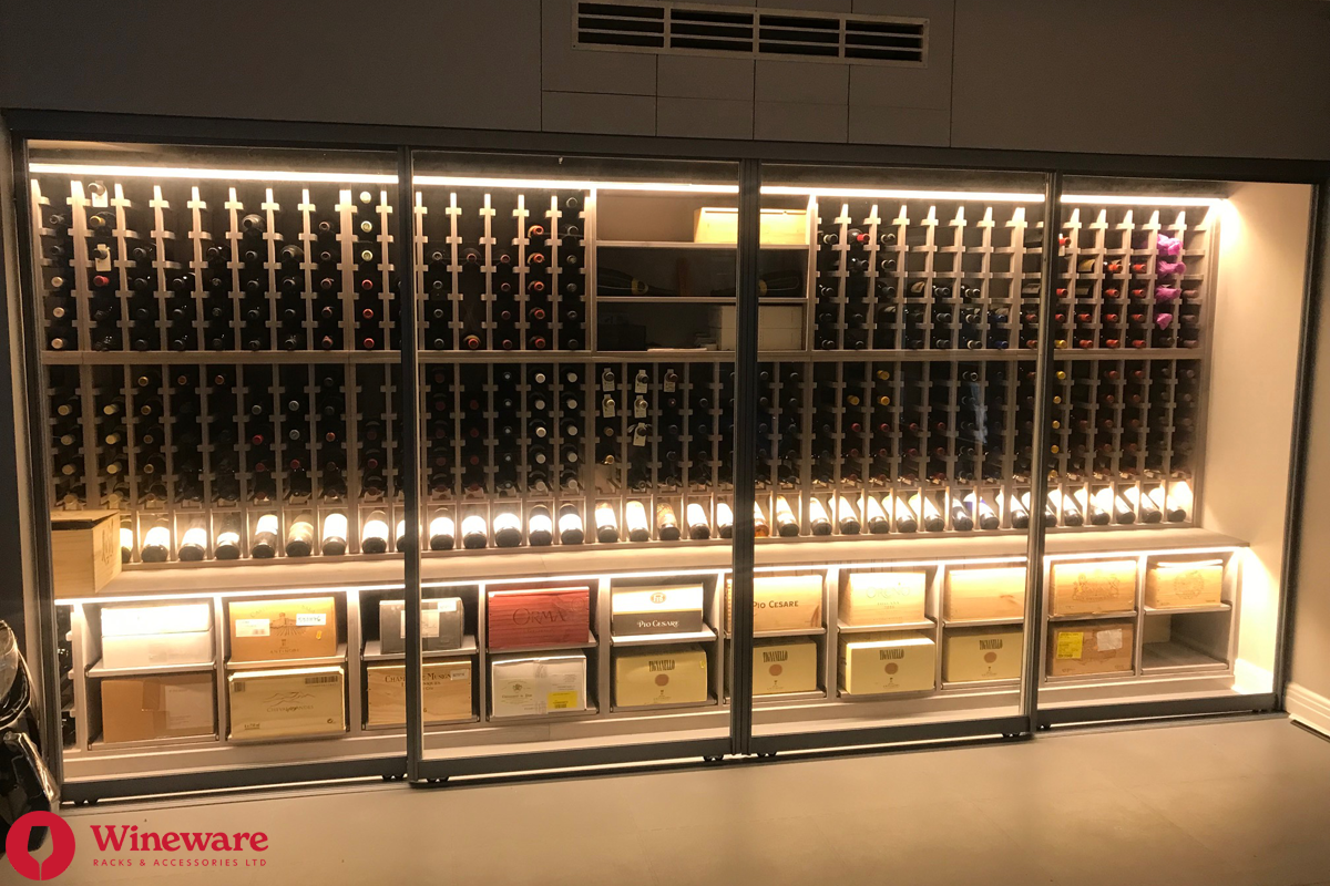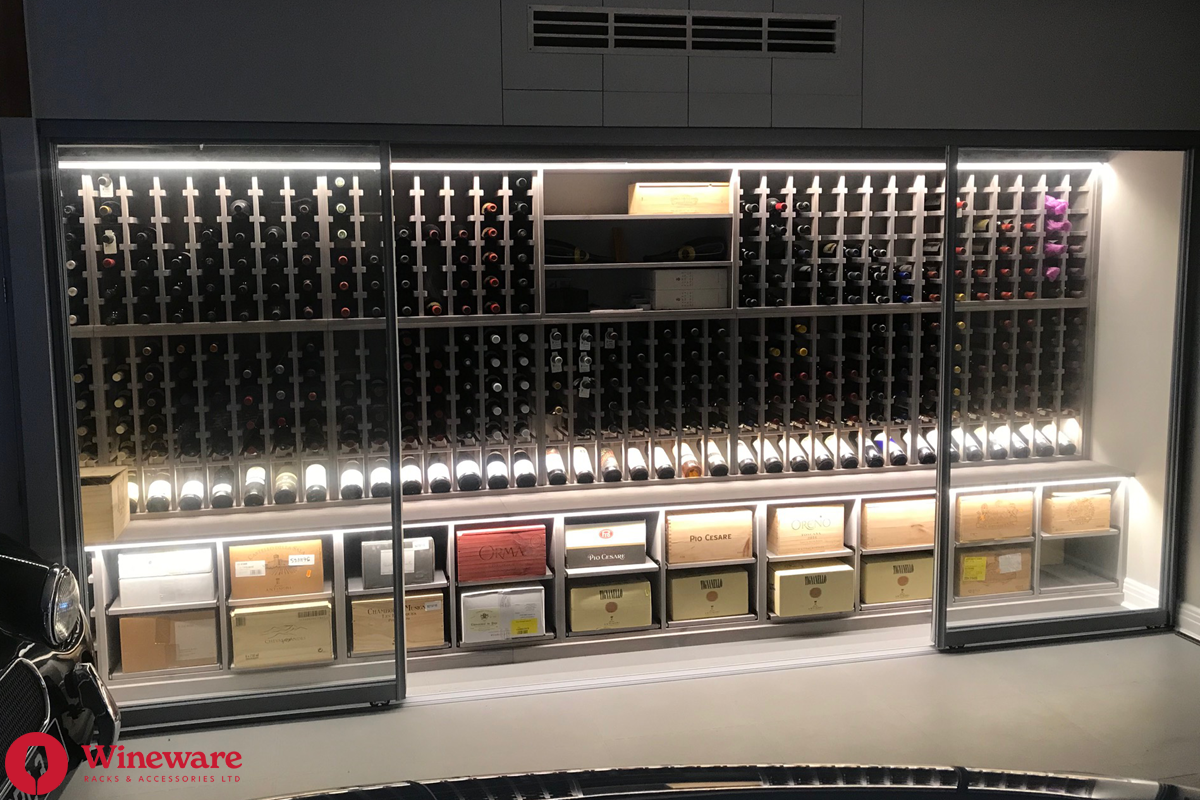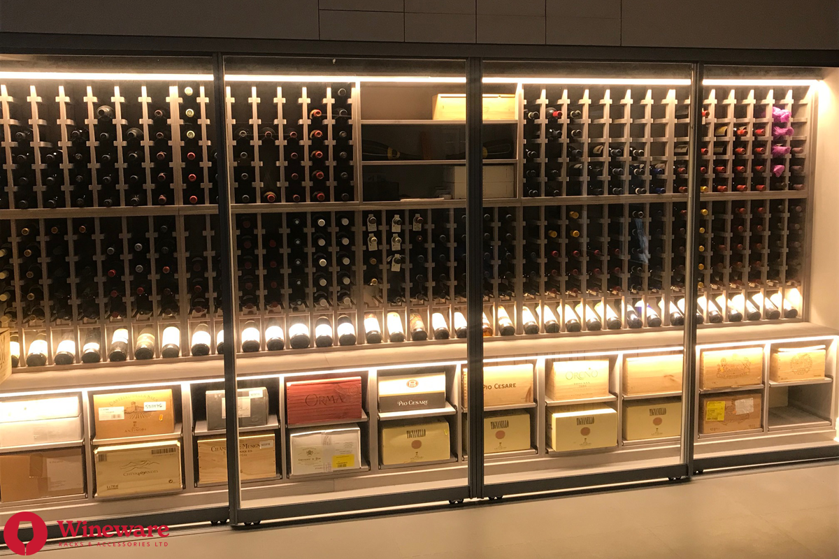 - Wine Rack Design: Individual bottle storage, individual display bottle storage, open display bottle shelving, case racks, worktops, plinths and LED lighting (Solid Pine - Grey Stain)
