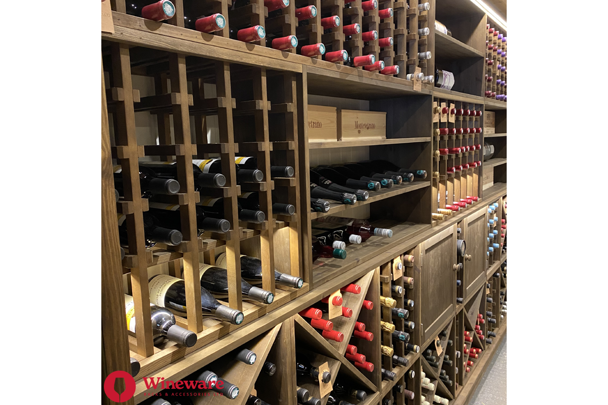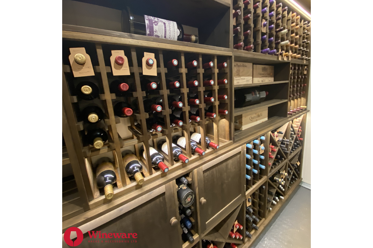 - Wine Rack Design: Cellar cubes, Case racks, individual bottle storage, angled display bottles, open area storage, worktops, plinths and LED lighting (Solid Pine - Dark Oak Stain)