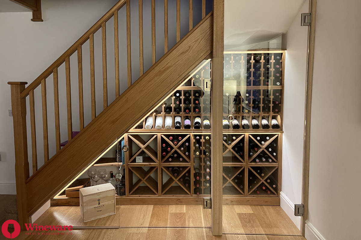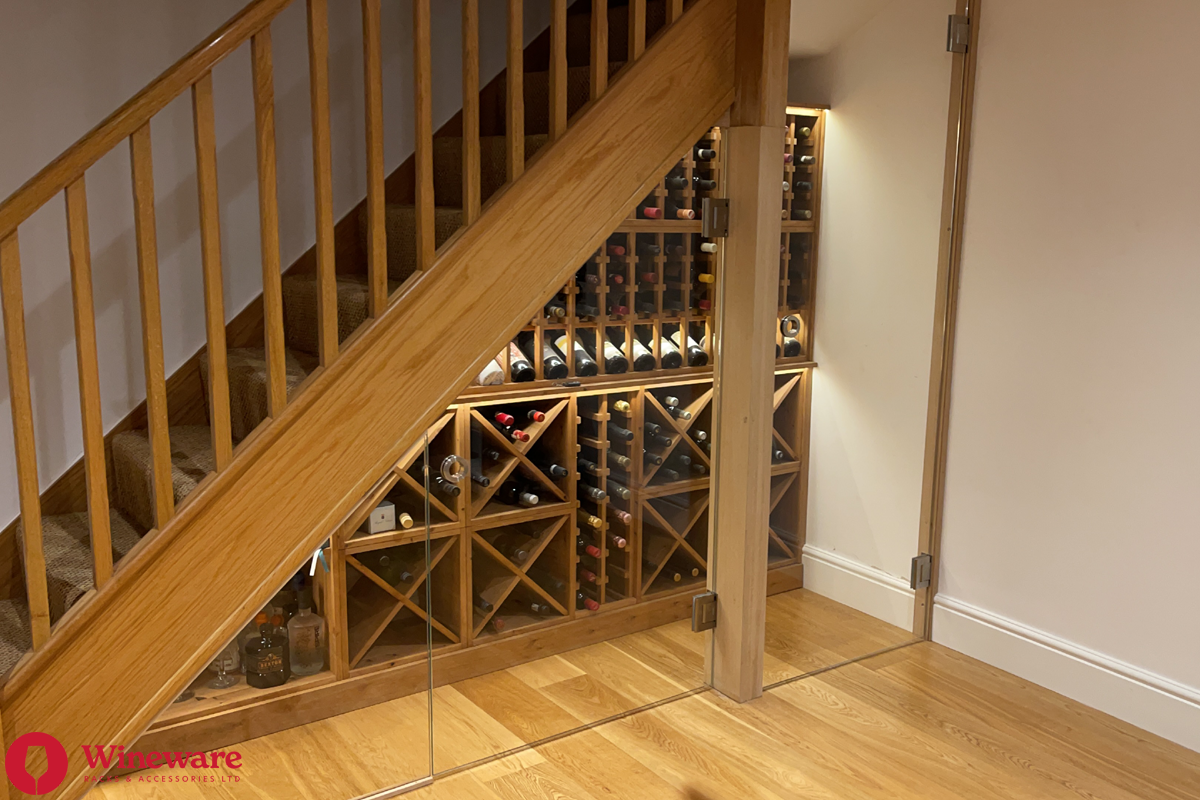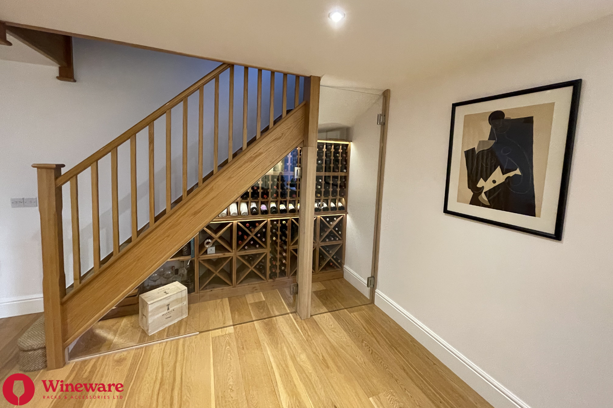This empty understairs area has now been transformed to store a collection of prized wines in a residential property in Loughborough, Leicestershire. The bespoke wine racking can now hold over 195 bottles, and there's an open shelving area for spirit bottles, glassware, etc. The racking was constructed in solid pine and finished with an oak stain, matching the surrounding decor and existing furniture within the property. All of the units were constructed offsite before delivery to the property to minimise the installation time on site. A contractor installed the additional glass wall and glass door feature once the racking was complete.