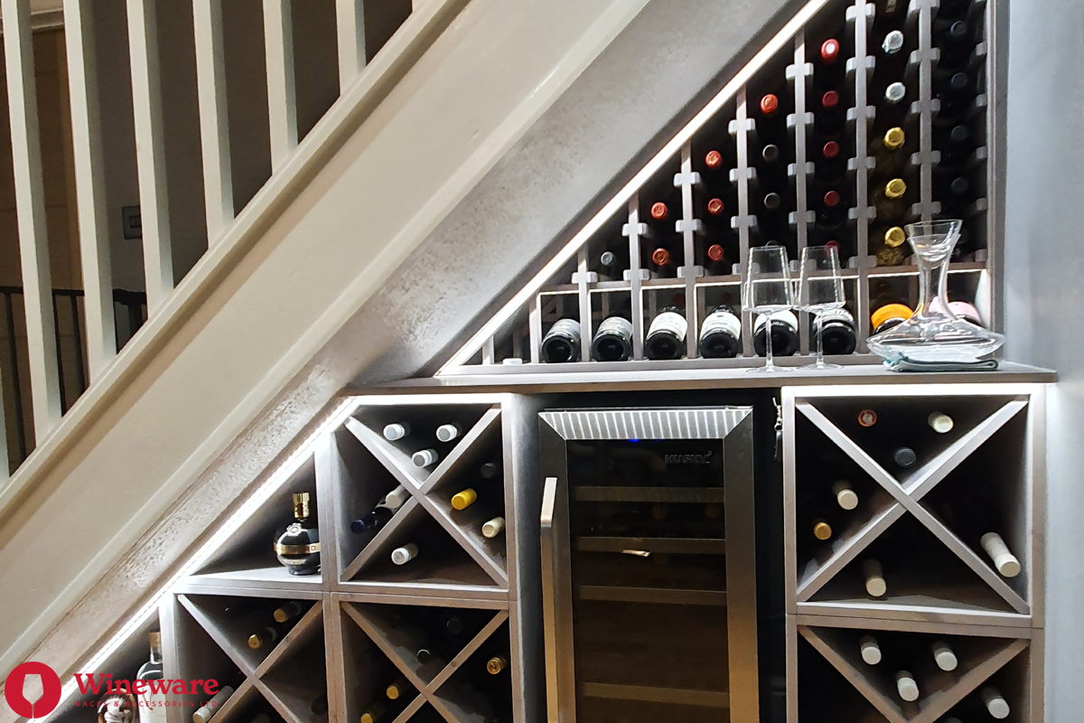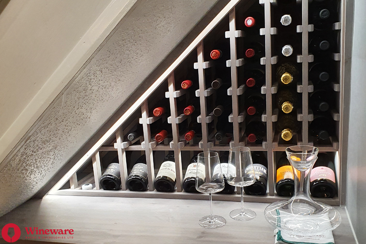 This empty understairs area has now been transformed to store a collection of prized wines in a residential property in Redditch, West Midlands. The bespoke wine racking provided by Wineware can now hold over 160 bottles. The racking was constructed in solid pine and finished with a modern grey stain, matching the surrounding decor and existing furniture. All the units were constructed offsite before delivery to the property to minimise the installation time on site.