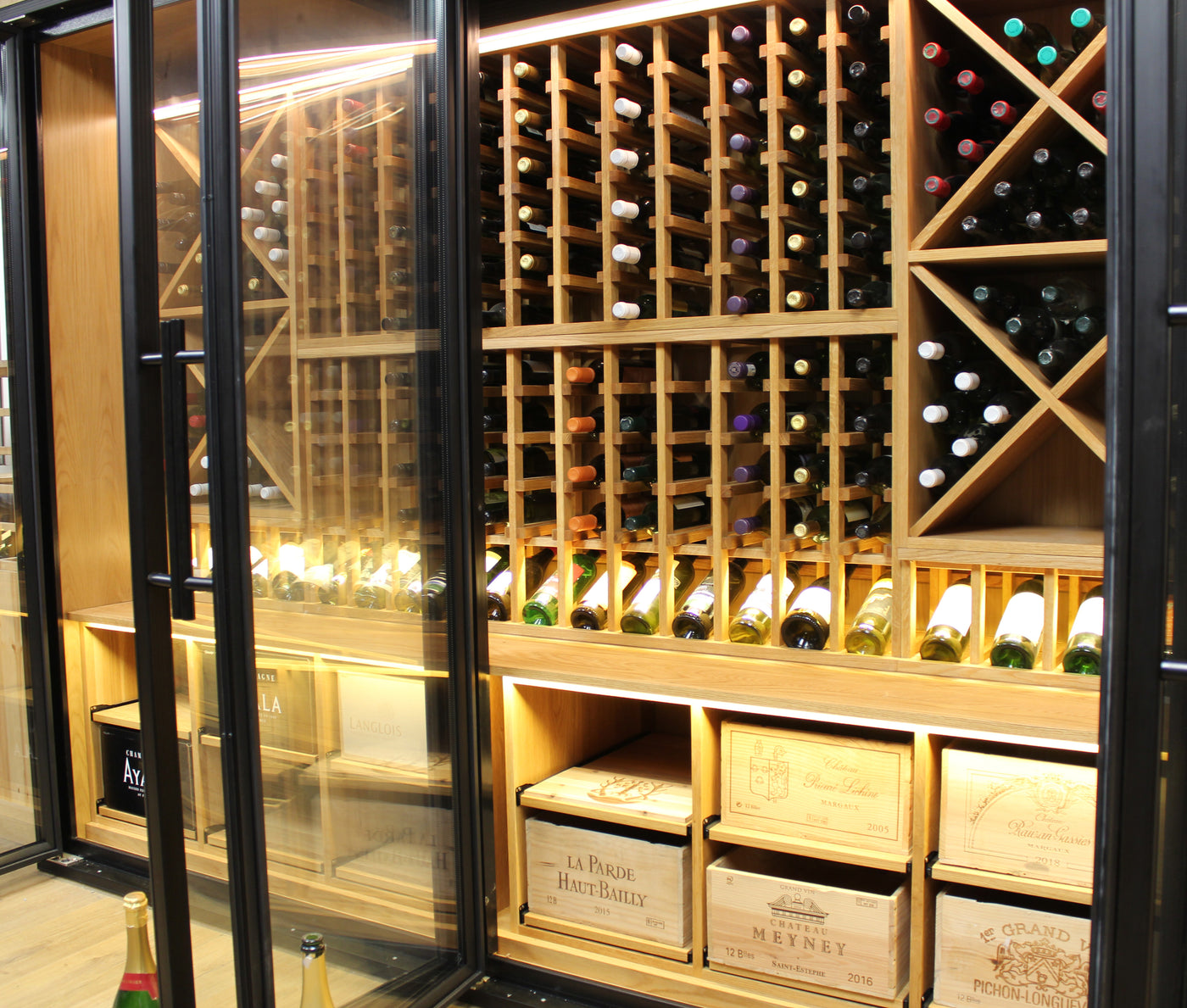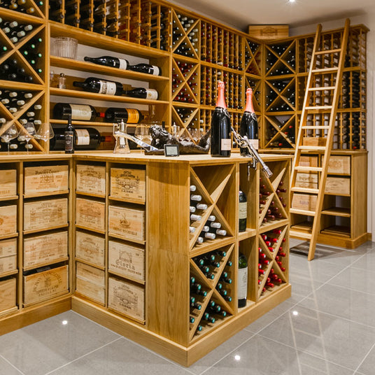 The minimum space required for a Wine Wall is 1.8m wide by 2.2m high, though these dimensions can be extended to suit your space. The internal racking is fully customisable, allowing you to maximise bottle storage, increase case-rack capacity, or create a layout that best suits your collection. All racking is crafted from solid oak for durability and a premium finish.