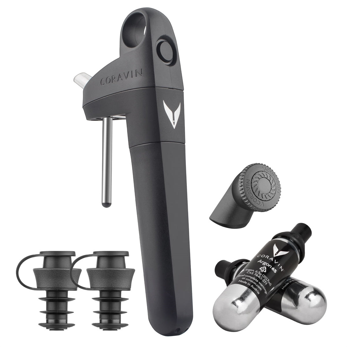 - Includes 1 x Coravin Pivot+ Black, 1 x Pivot Aerator, 2 x Coravin Pivot Stoppers and 2 x Coravin Pure Gas Capsules, 1 x Coravin Bottle Sleeve
