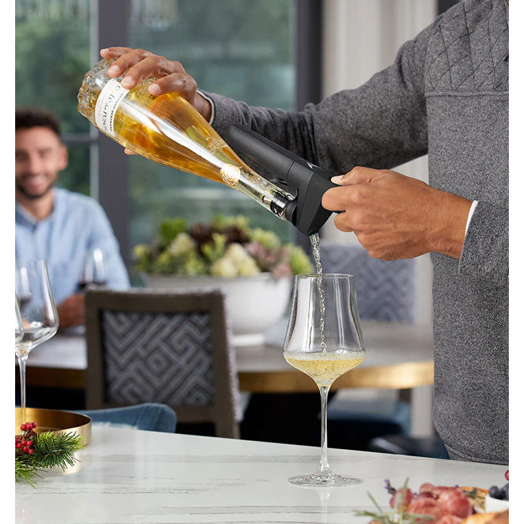 2. Pour the wine - To pour, insert the Pivot+ Device through the Stopper. Tilt the bottle so the spout is over the wine glass, press and hold the button on the Device. Release the button and bring the bottle upright to stop the pour.