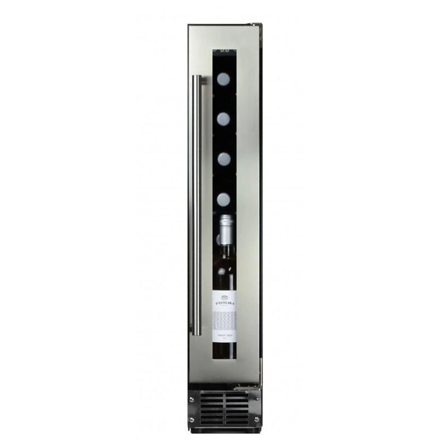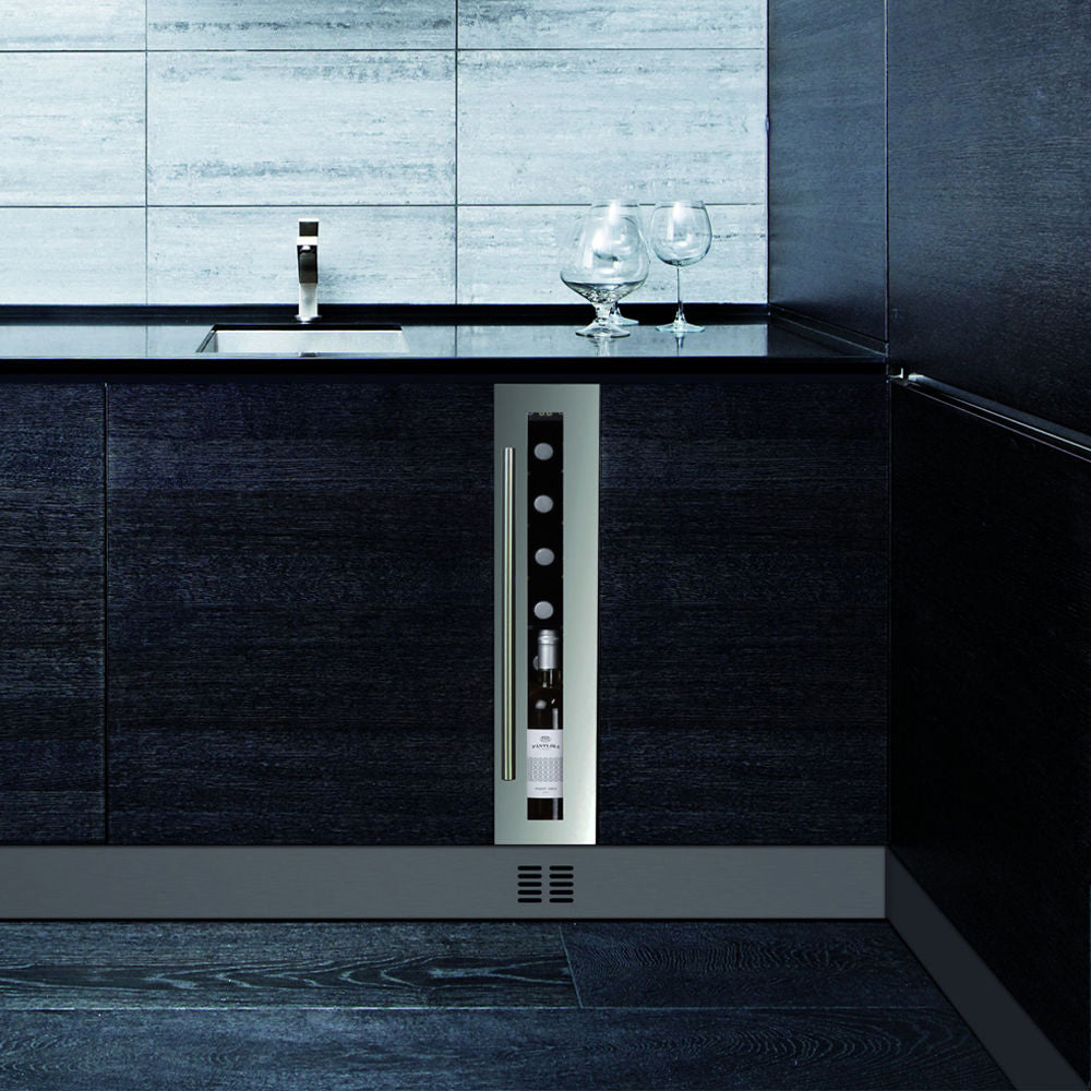A single zone, 9-bottle undercounter model. Its elegant appearance and stainless steel door handle make it especially representative in modern kitchens with limited space. The bottles are supported on fixed shelves set into a stunning light white interior. Please note that this model is intended as a built-in undercounter unit.