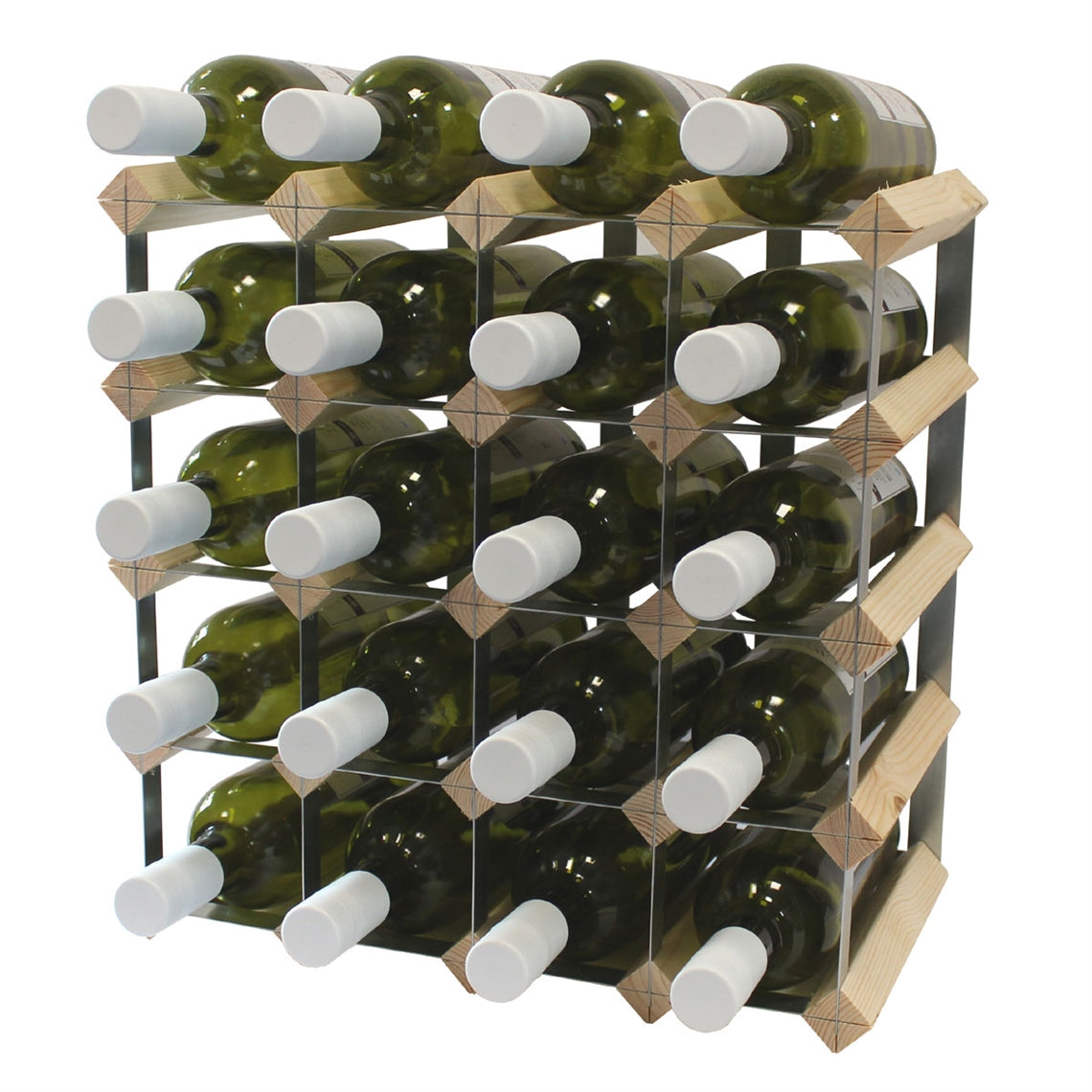 This 20-bottle wine rack is made from natural pine wood & galvanised steel. You can store 16 bottles inside the rack and then 4 on top; it's designed for standard wine bottles, so Burgundies and Champagnes might struggle inside the rack but will be fine on the top row. The depth is 220mm, so the bottleneck will protrude from the rack, making it ideal for using bottle neck tags to label and locate your wine quickly.