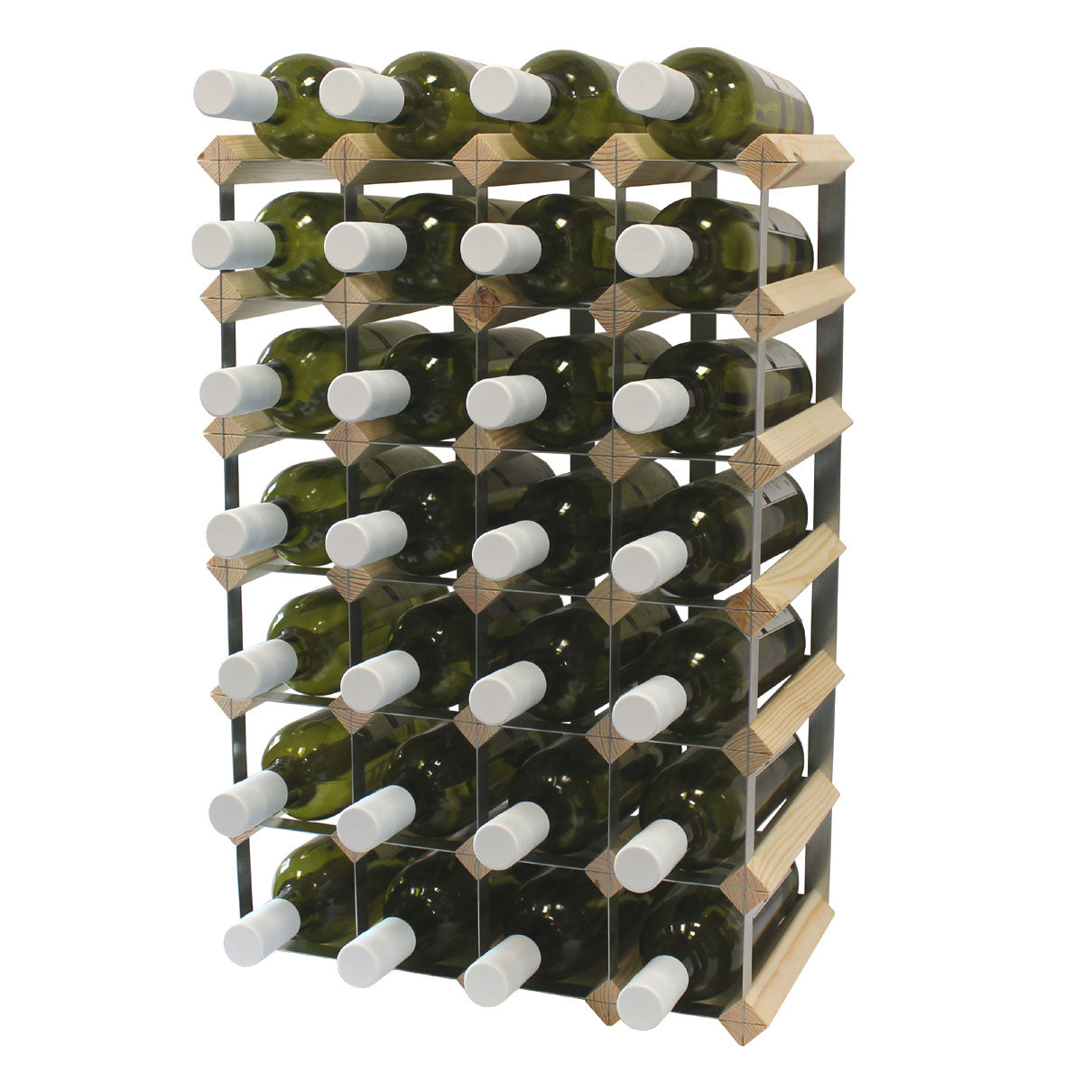 This 30-bottle wine rack is made from natural pine wood and galvanised steel. It can hold 24 bottles inside and 6 on top (in the 6W x 4H format). It's designed for standard wine bottles, so Burgundies and Champagnes might struggle inside the rack but will be fine on the top row. The depth is 220mm, so the bottleneck will protrude from the rack, making it ideal for using bottle neck tags to label and locate your wine quickly.
