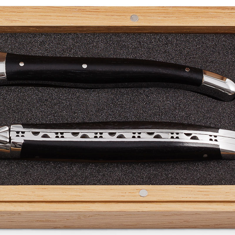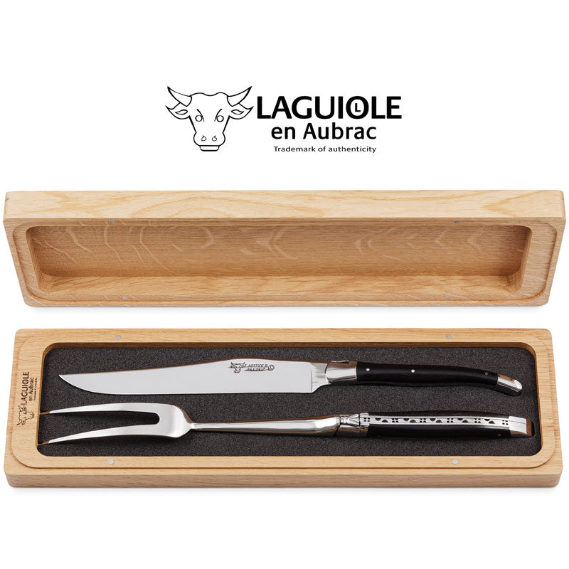 The Laguiole en Aubrac 2-piece set consists of a carving knife and holding fork, both with beautiful Ebony Wood Handles. This 2-piece serving set is supplied in a unique black plastic presentation box.