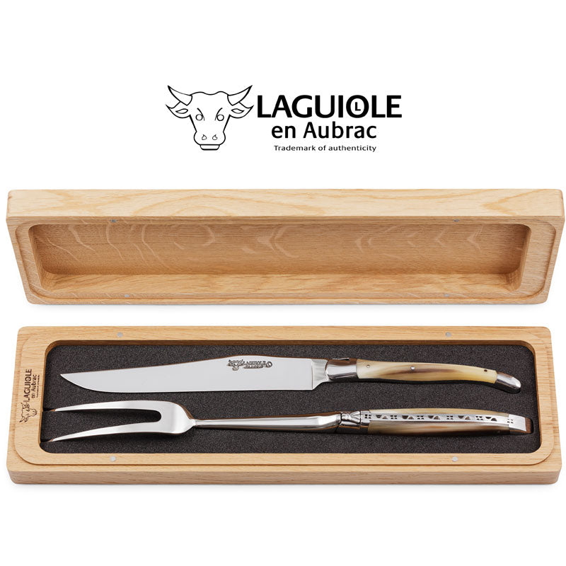 Laguiole en Aubrac 2 Piece Knife and Fork Carving Set - Light Horn Handles