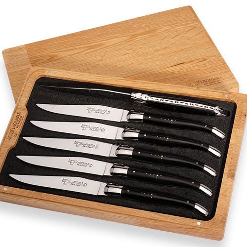 The Laguiole en Aubrac 6-piece set consists of steak knives, all with beautiful Ebony Wood Handles. This 6-piece serving set is supplied in a unique Laguiole en Aubrac presentation box.