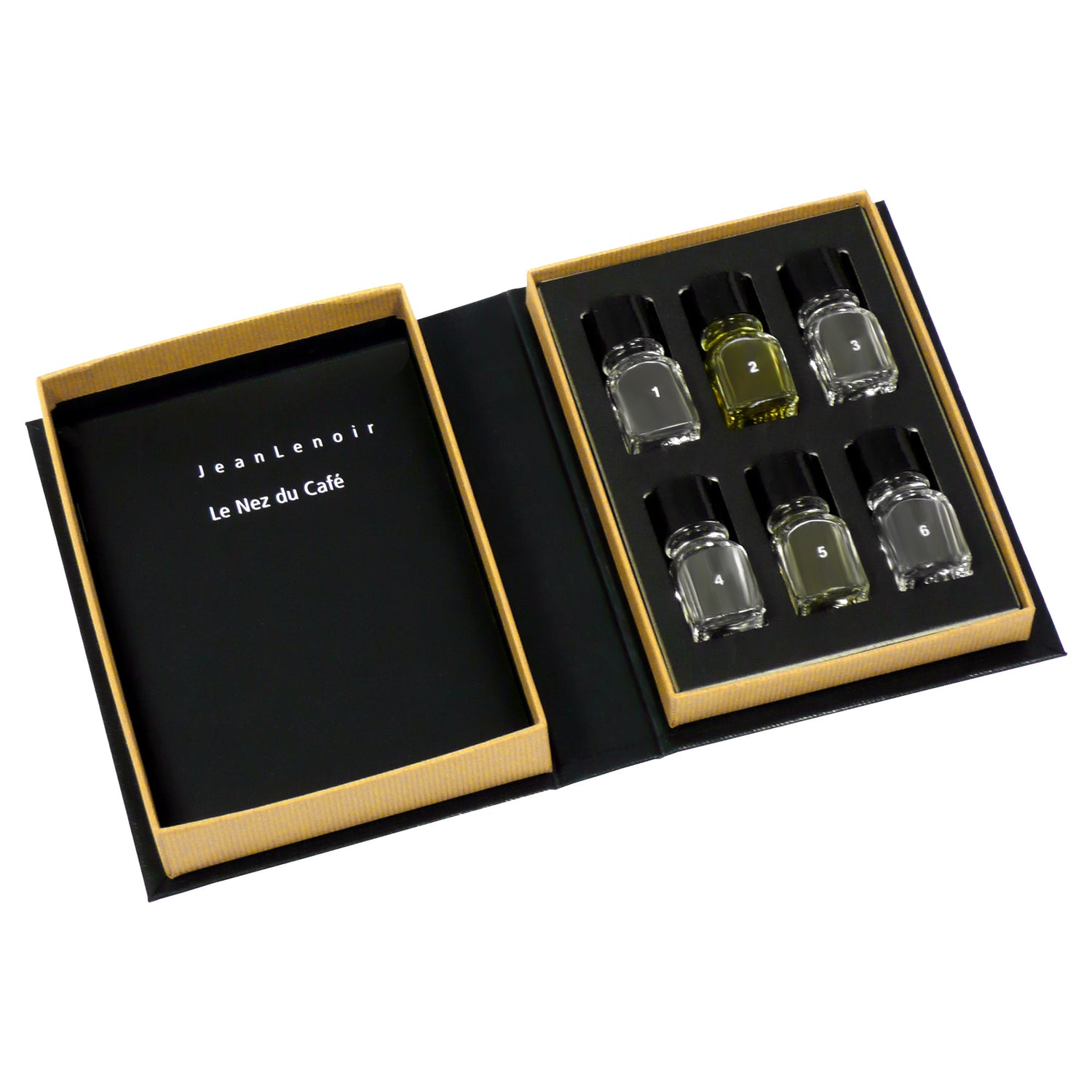 Le Nez du Café includes six aromas in a small black cardboard box with an explanatory leaflet.