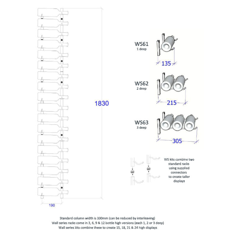 A standard wine bottle (750ml) averages 300mm in length. For this size bottle, the strips should be mounted 190mm apart (starting a minimum of 70mm from your first perpendicular wall) and then 140mm between sets of racks. Each complete rack, therefore, requires approximately 330mm of space, side-to-side, for installation with standard bottles.