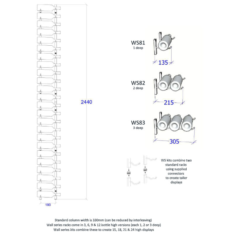 A standard wine bottle (750ml) averages 300mm in length. For this size bottle, the strips should be mounted 190mm apart (starting a minimum of 70mm from your first perpendicular wall) and then 140mm between sets of racks. Each complete rack, therefore, requires approximately 330mm of space, side-to-side, for installation with standard bottles.