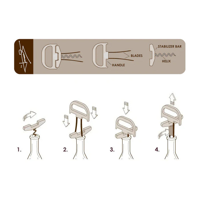 - With BLADES on either side of STABILIZER BAR, insert first the “long” then the “short” BLADE between the cork and bottle.