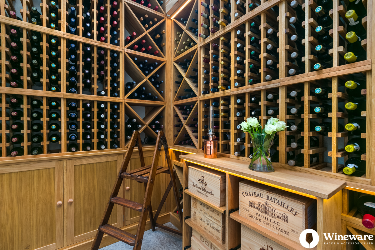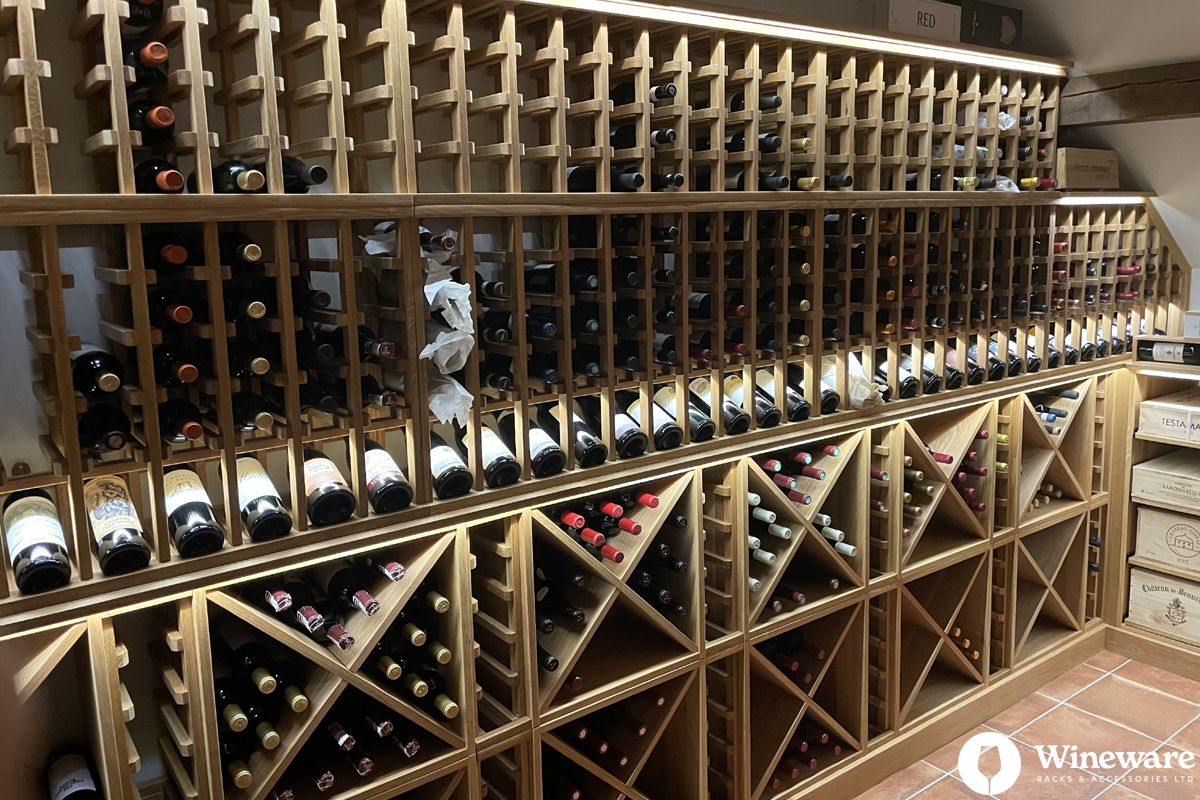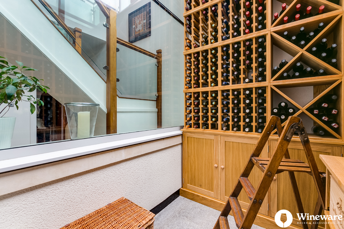 These bespoke oak wine racks are manufactured in 'ladders' where each bottle rests on two horizontal slats on either side of the upright. This storage system enables bottles to be withdrawn from the rack without the fear of damaging labels, as there are very few solid horizontal lines. The few solid horizontal pieces that do exist are necessary because the weight of the oak racks and the wine to be cellared within means that the modular units aren't built too large. We usually restrict these to heights and widths of around 6 to 10 bottles.