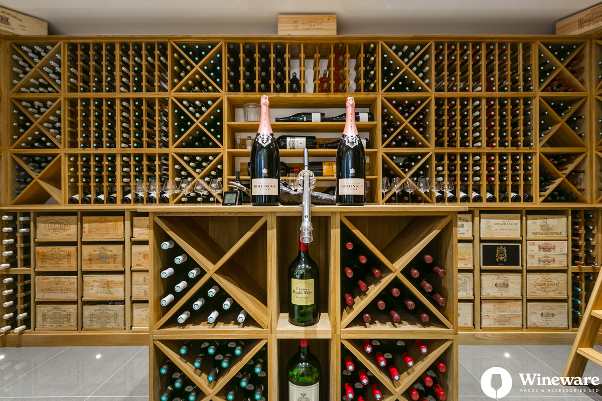 Each bottle rack section is made to a depth of 298mm, where the entire bottle is enclosed within the rack; this can be increased. If this is required, a depth of 598mm enables two bottles to be stored in each opening, with one in front of the other. We can also provide individual bottle racking to accommodate non-standard-sized bottles such as half bottles, magnums, and champagnes. The utmost care is taken to ensure that all rack heights match other design units.