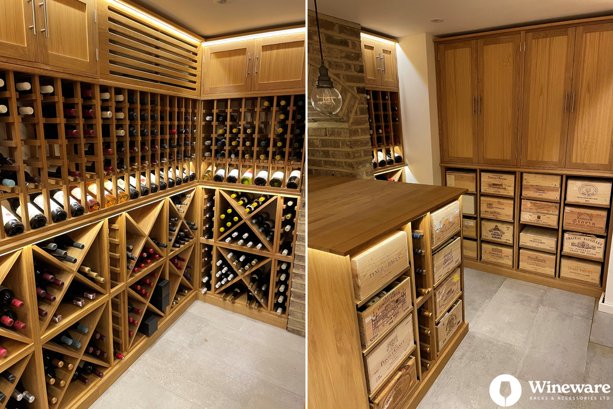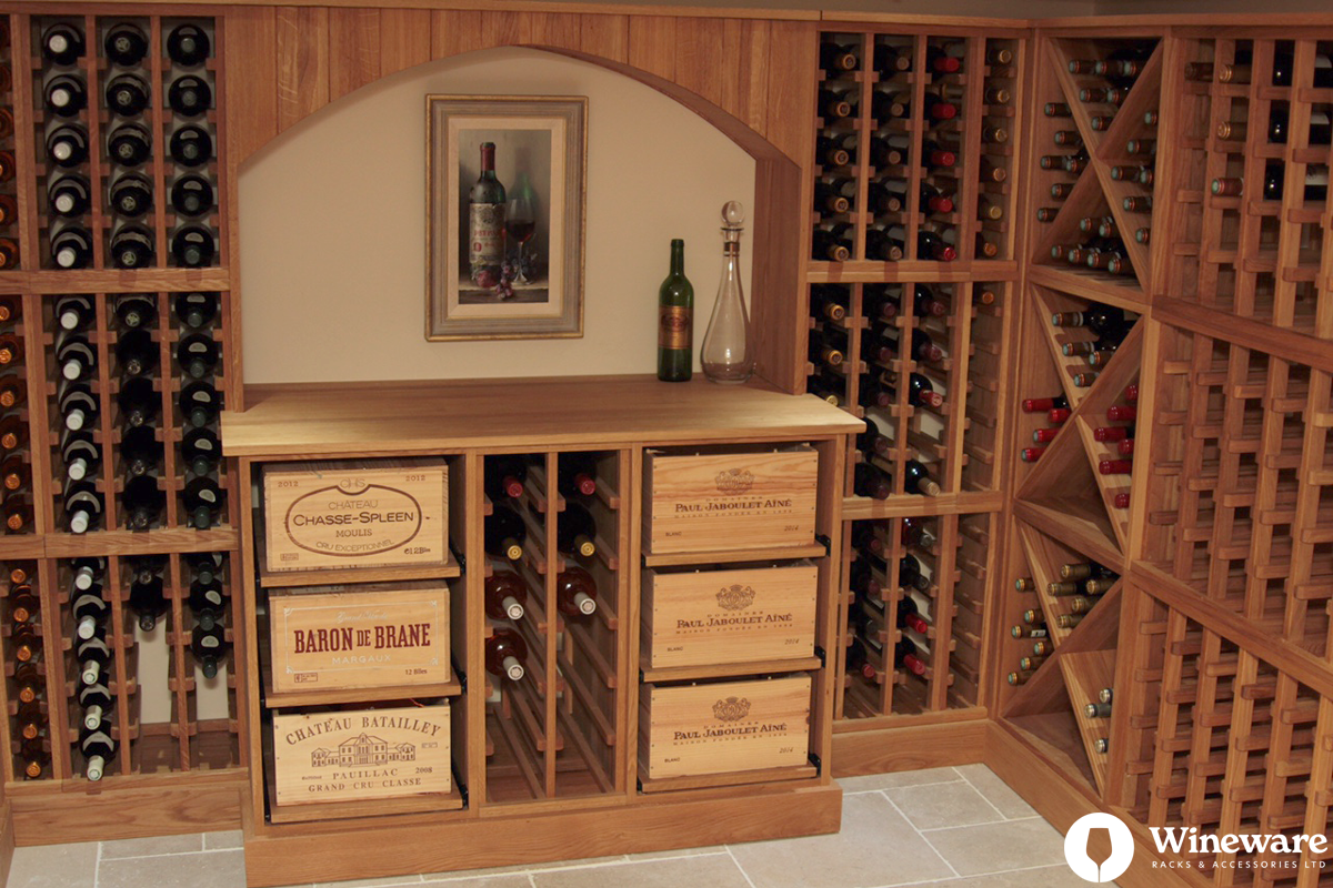 Wooden cases of Bordeaux with the stencilled names and logos of the Chateaux featured on the case ends, all stacked on top of each other, look great, but the ones that are ready for drinking are always the first ones, purchased, on the bottom of the stack! The answer to this age-old problem is our wine case racking. This system allows each 12-bottle case to be stored on its own slide-out, easy-glide oak shelf within a solid oak cabinet surround.