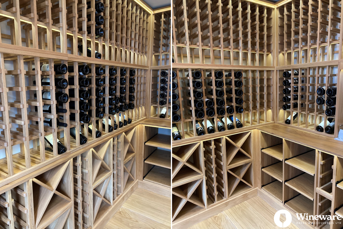 Solid oak cellar storage cubes are a novel and visually appealing way of storing bulk quantities of the exact wine once unpacked from their cases. Different-sized cubes are available; the 503mm x 503mm is capable of holding up to two full cases of wine, 24 bottles in total (6 in each section), and the 598mm x 598mm can hold up to 40 bottles in total (10 in each section). The diagonal cross pieces of the cube are mitred into each corner for added strength and visual appeal, and with or without the optional backing, a clean, quality wine storage solution is the result.